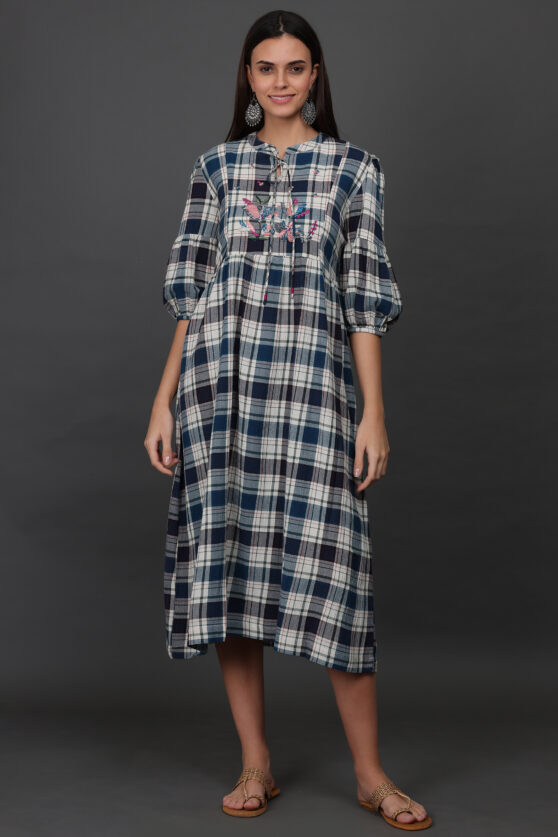 TWILL HAND EMBROIDERED CHECKERED DRESS