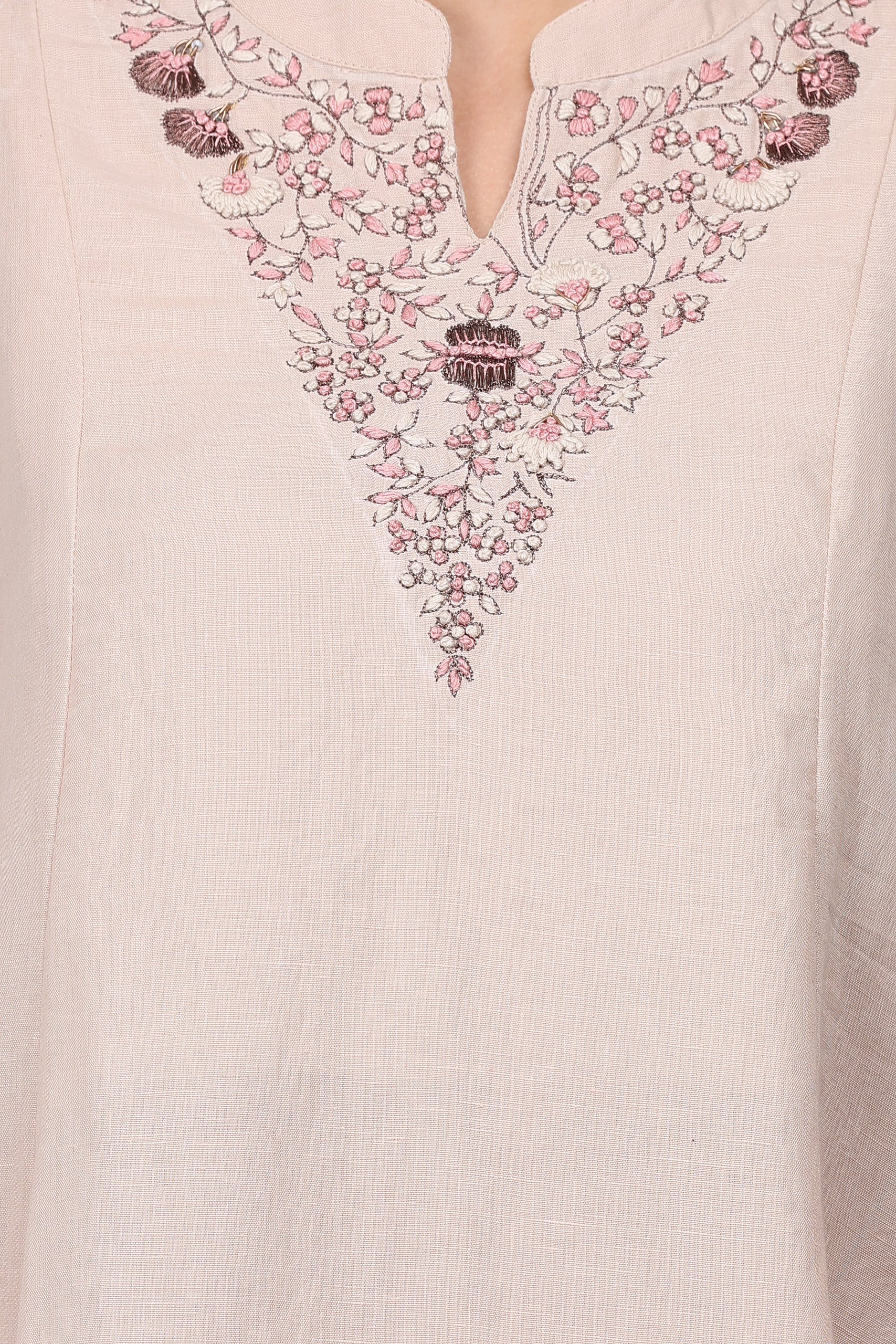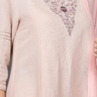 Description: V NECK DELICATE HAND ZARDOZI EMBROIDERED A LINE COTTON LINEN KURTA