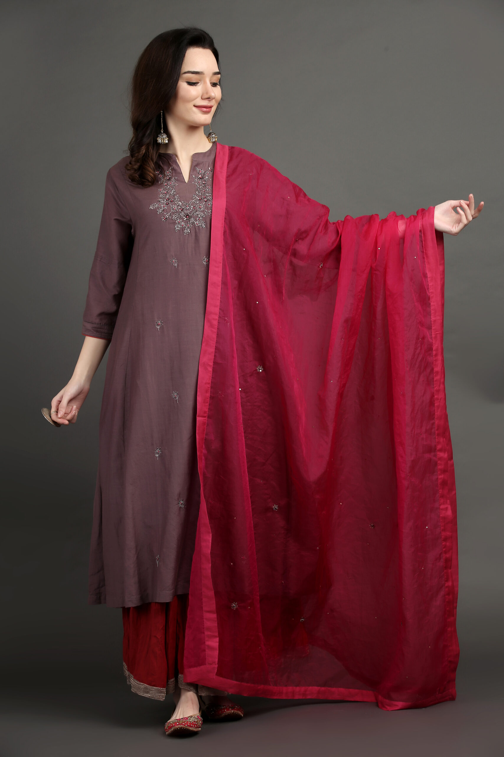 ALL OVER HAND EMBROIDERED A LINE KURTA, PANT & DUPATTA (Set of 3)