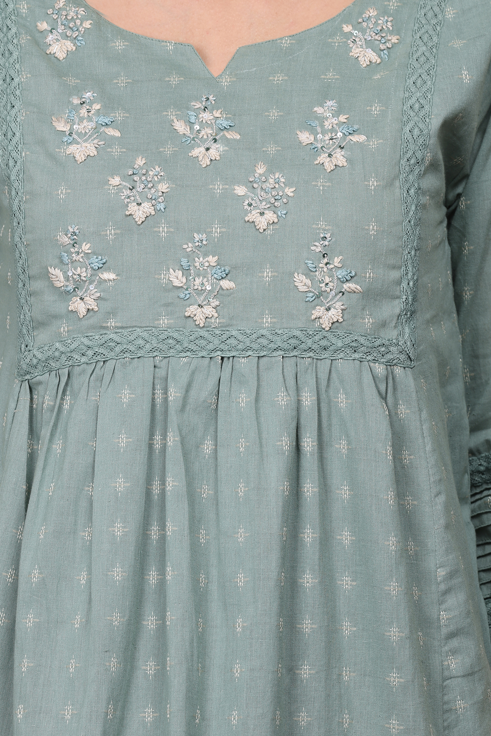 Description: Zardozi hand embroidered cotton jacquard bohemian kurta with lace and pintuck detail at yoke and sleeve