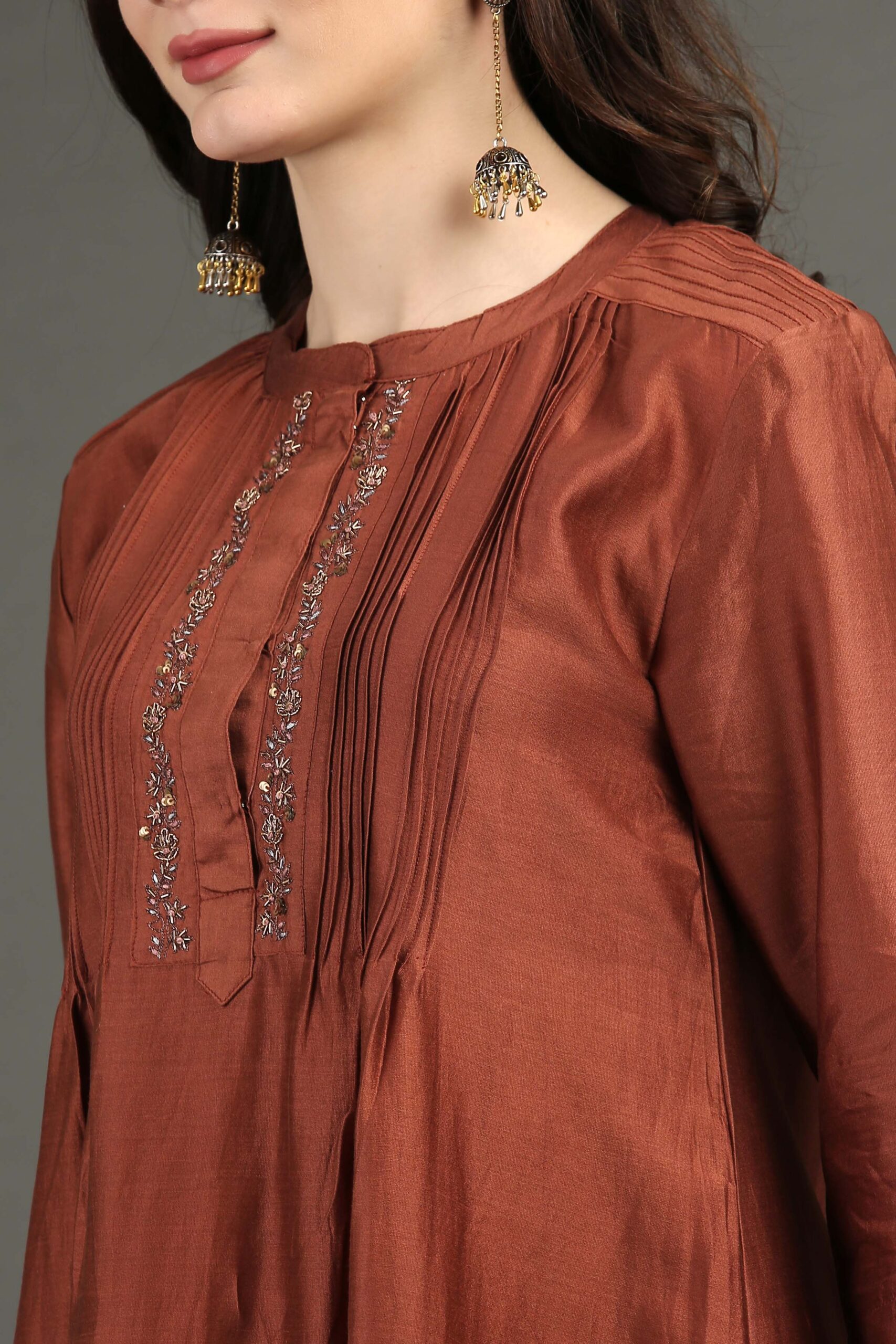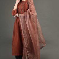 < class="product-title">Rust Hand Embroidered Kurta With Pintuck Detail With Hand Embroidered Adhjustable Pants And Dupatta(Set Of 3)>