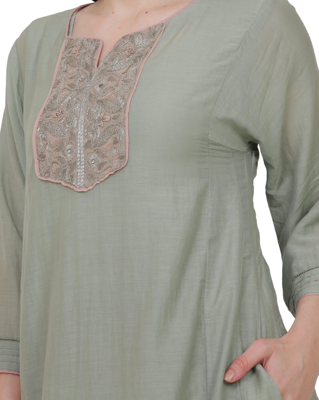 Cotton Silk Hand Thread Embroidered Kurta,Cotton Silk All Over Hand Thread Embroidered Dupatta,Cotton Dobby Crikled Skirt With Tissue Border(Set Of 3)